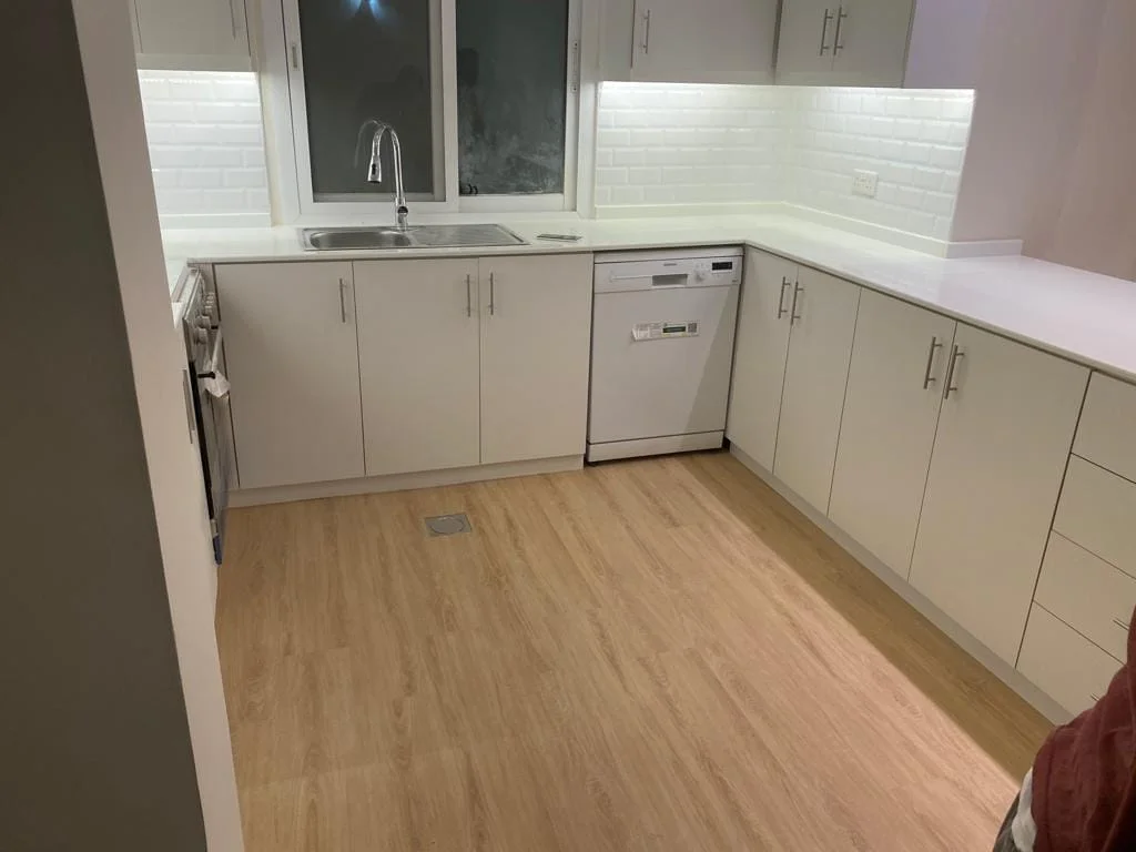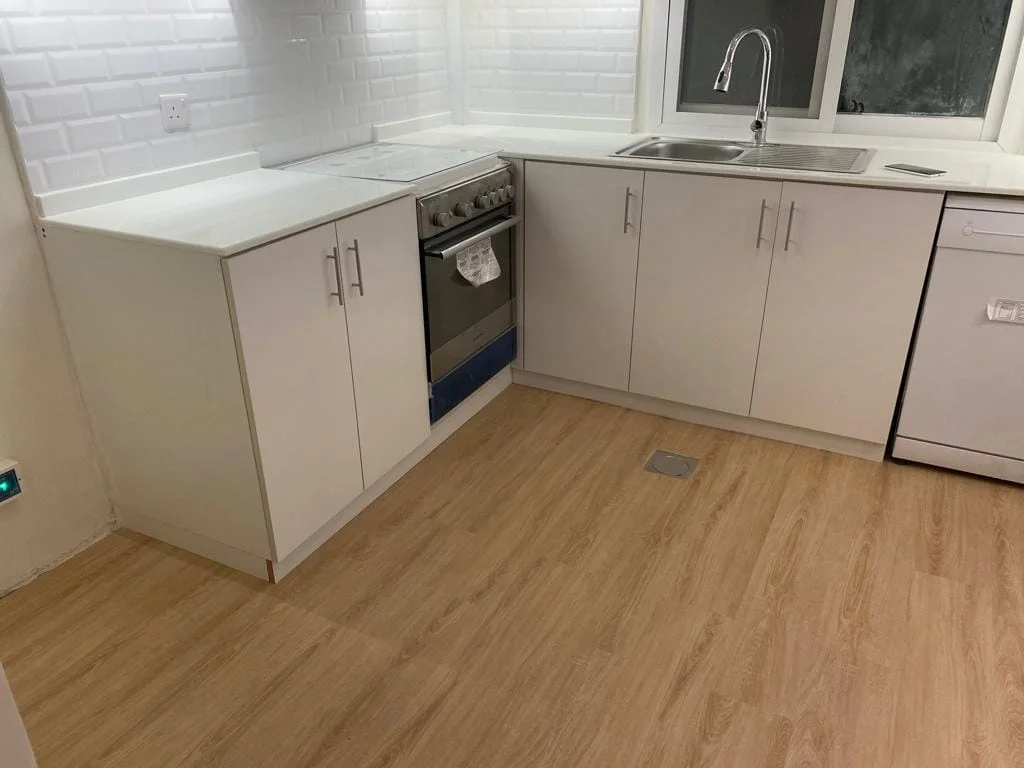 • Before: The kitchen had outdated flooring that showed significant wear and tear.
